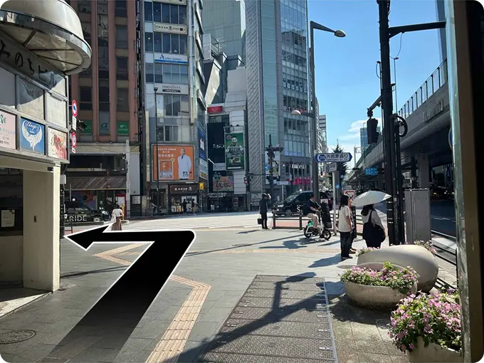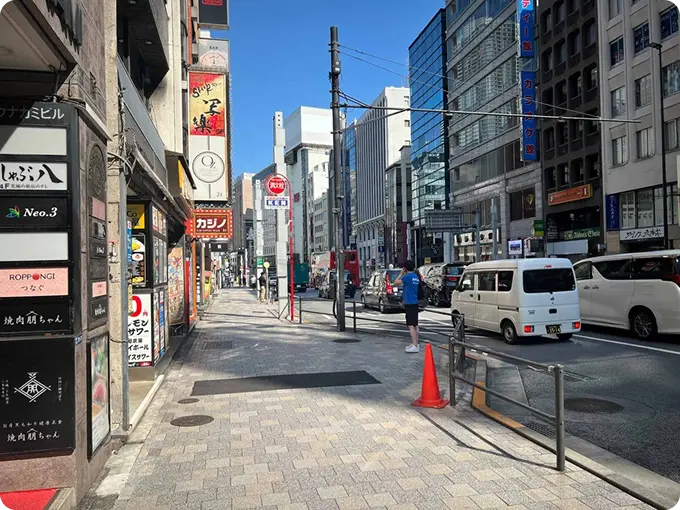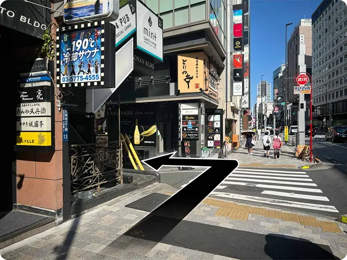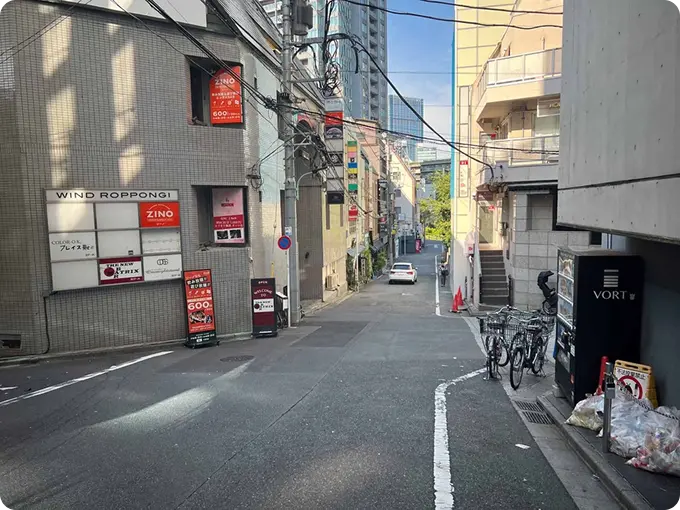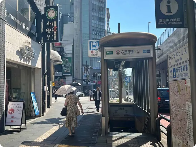 「六本木」駅5番出口を出てすぐに反対方向(六本木交差点方面)に進みます。